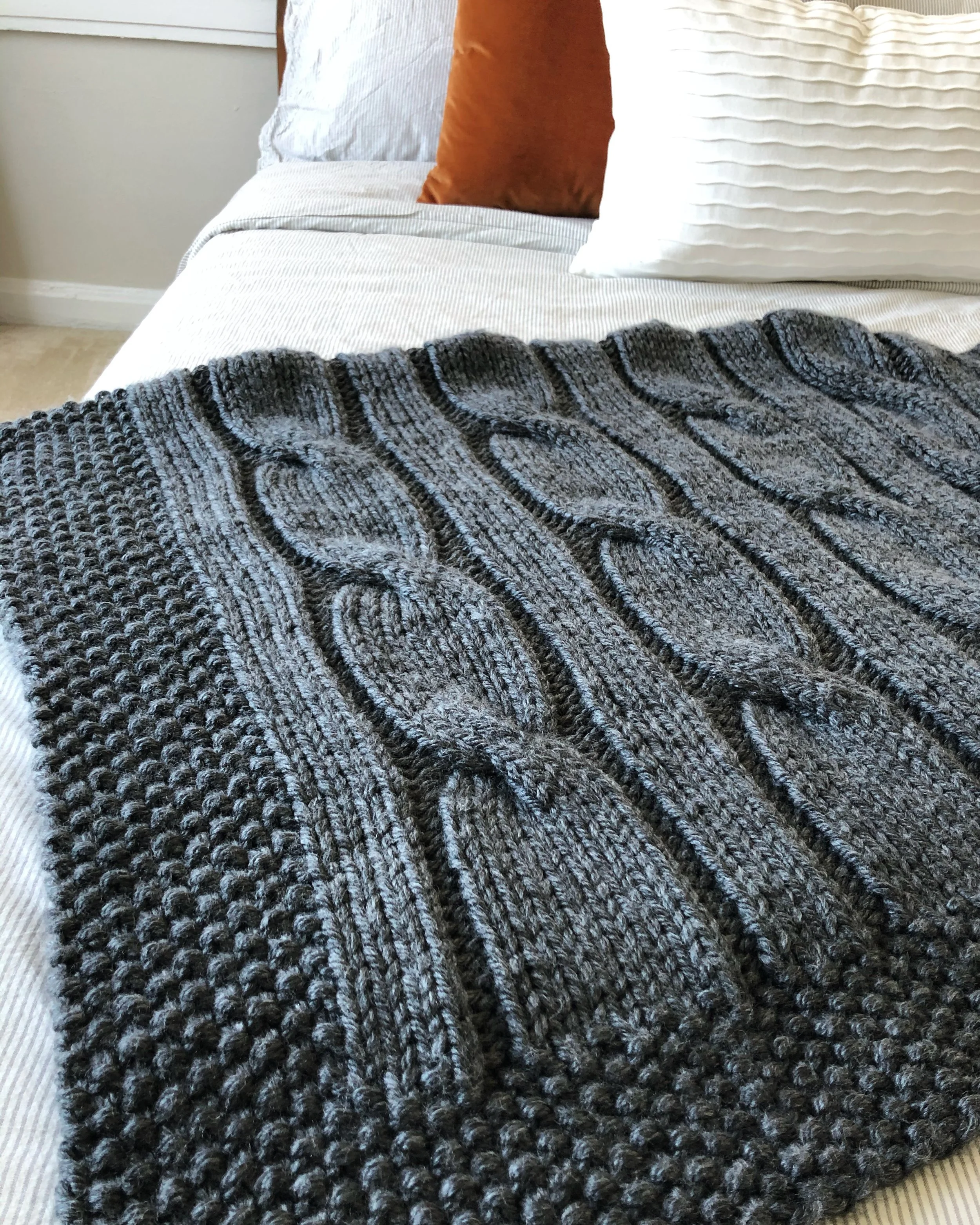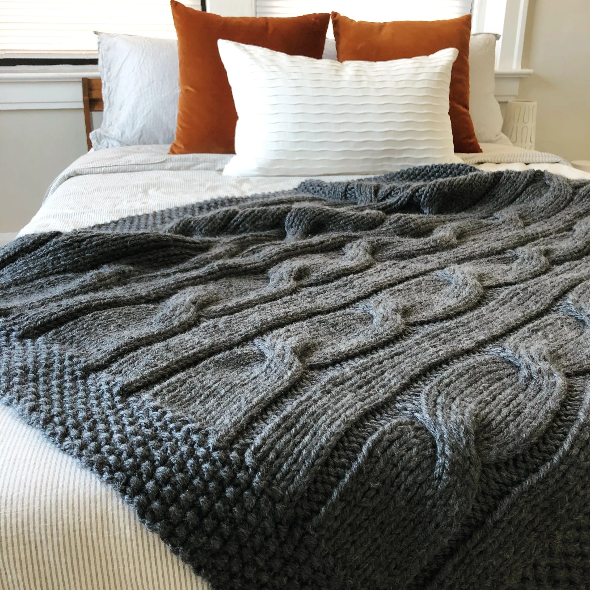 North of the River cable blanket knitting pattern for super bulky #6 weight yarn. I used Lion Brand Hometown super bulky yarn in the color 'Chicago Charcoal'. I’m thrilled with how this yarn worked for this project… great stitch definition that allows the cables to ‘pop’. Click to purchase the PDF instant download knitting pattern.